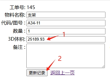 3、将测量的体积更新到系统(系统会自动关联计算包装重量、运输费用、热处理单价、表面处理单价等) ;按1、2流程操作即可;