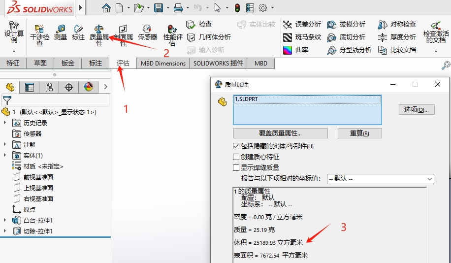 1、SLDWORKS软件测量体积方法 ,按1、2、3流程打开即可查看;