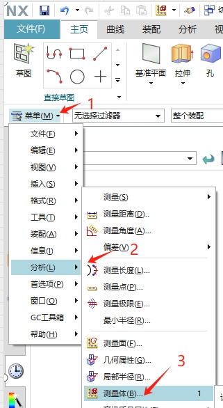 2、UG软件测量体积方法 ,按1、2、3流程打开即可查看;